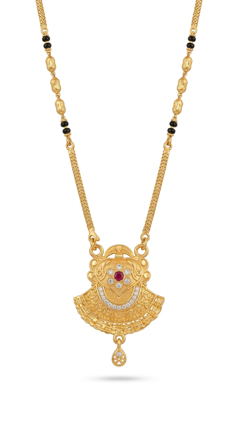Elevate your style with our Gold-Plated Short Fancy Mangal Sutra Pendant (Poth) adorned with sparkling stones and a touch of diamond. This exquisite pendant blends traditional charm with a modern, fancy design, perfect for women who love elegance with a hint of glamour. Lightweight and durable, it’s ideal for daily wear, festive occasions, or gifting.
