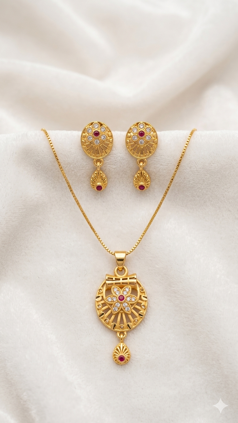 Add a touch of elegance and charm to your jewellery collection with our gold plated chain pendant earrings set for women. This beautifully designed set combines a stylish pendant chain with matching earrings, giving you a complete classy and fashionable look.
