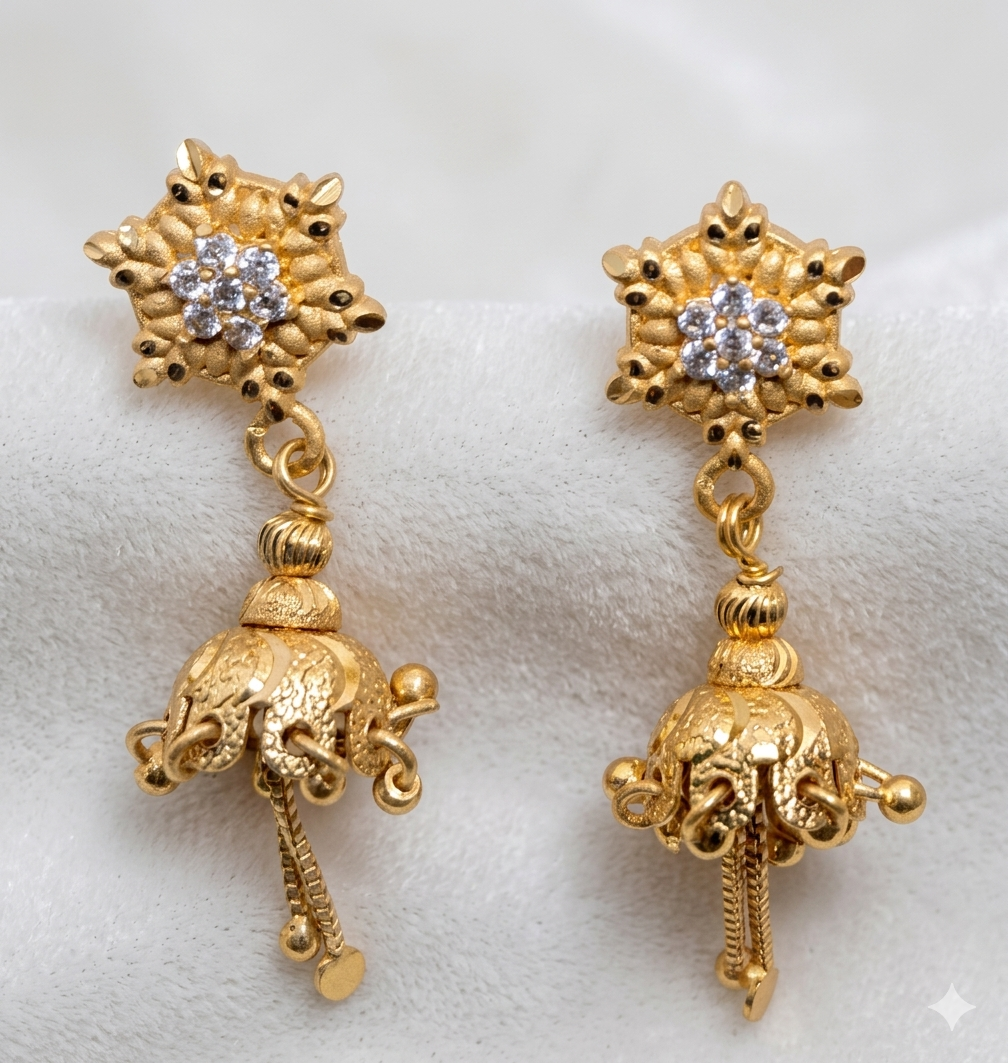 Celebrate tradition with our Gujarati-style gold-plated jhumka earrings adorned with sparkling stones 💛