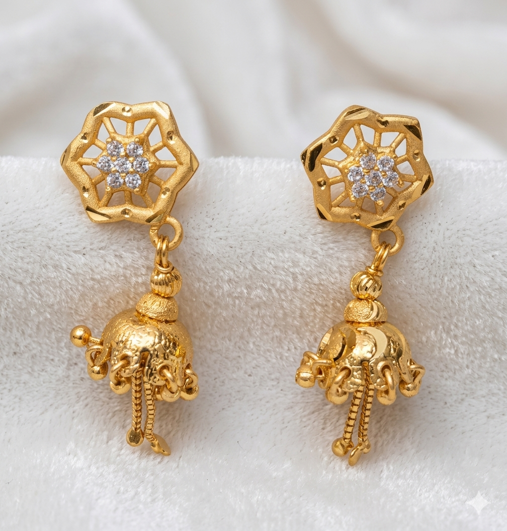 Celebrate tradition with our Gujarati-style gold-plated jhumka earrings adorned with sparkling stones 💛