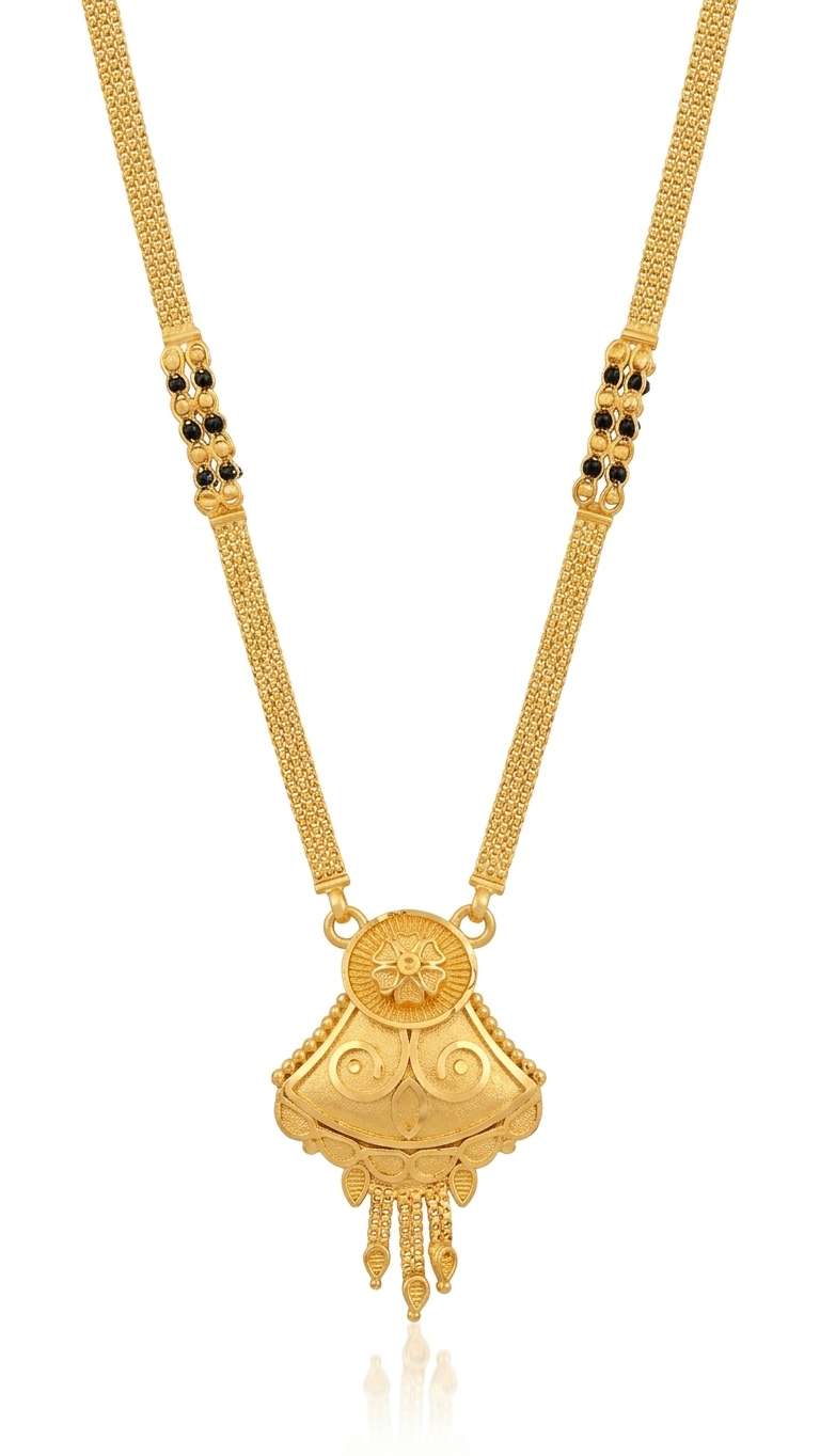 Enhance your elegance with this short gold-plated mangal sutra pendant (poth). Its delicate and lightweight design makes it ideal for everyday wear or special occasions. Paired with a black-beaded chain, this pendant blends traditional charm with modern style. Perfect for gifting or personal use.